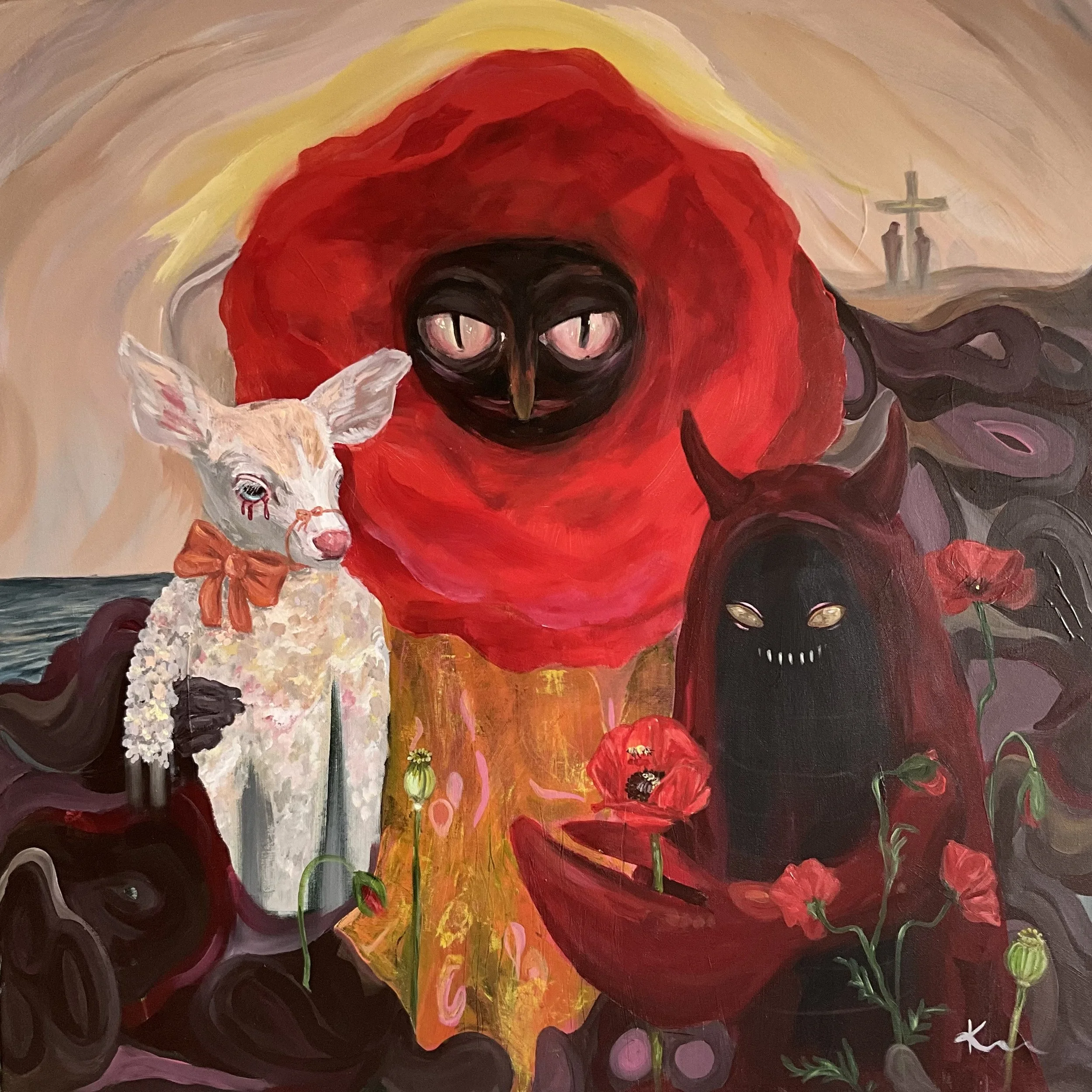 Etter et stort tap skapte Katinka dette maleriet, hvor tre selvrefleksive skikkelser vokser opp av jorden. Bildet er i privat eie.